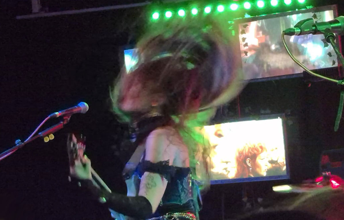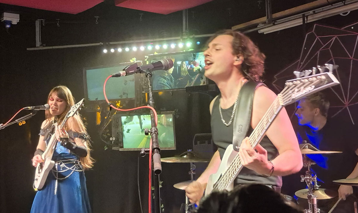 It’s true! For a trio, they produce a full and complex sound, achieved with a lot of skill, and a bit of technology. Both singer and bassist also play keyboards in parallel to their guitar work. The bassist augments Parker’s traditional drumming with Prodigy style samples and techno beats, whilst the vocalist plays more classical, harpsichord toned, arpeggios. The latter requires a two-handed technique, not easy when you have a guitar slung around your neck. She achieves this with a bespoke keyboard stand, which allows her to quickly pull the instrument in front of her to play, and whisk it away when not required. At this point, it’s no surprise to learn that this was also engineered by Taho, who’s obviously a man of many talents!