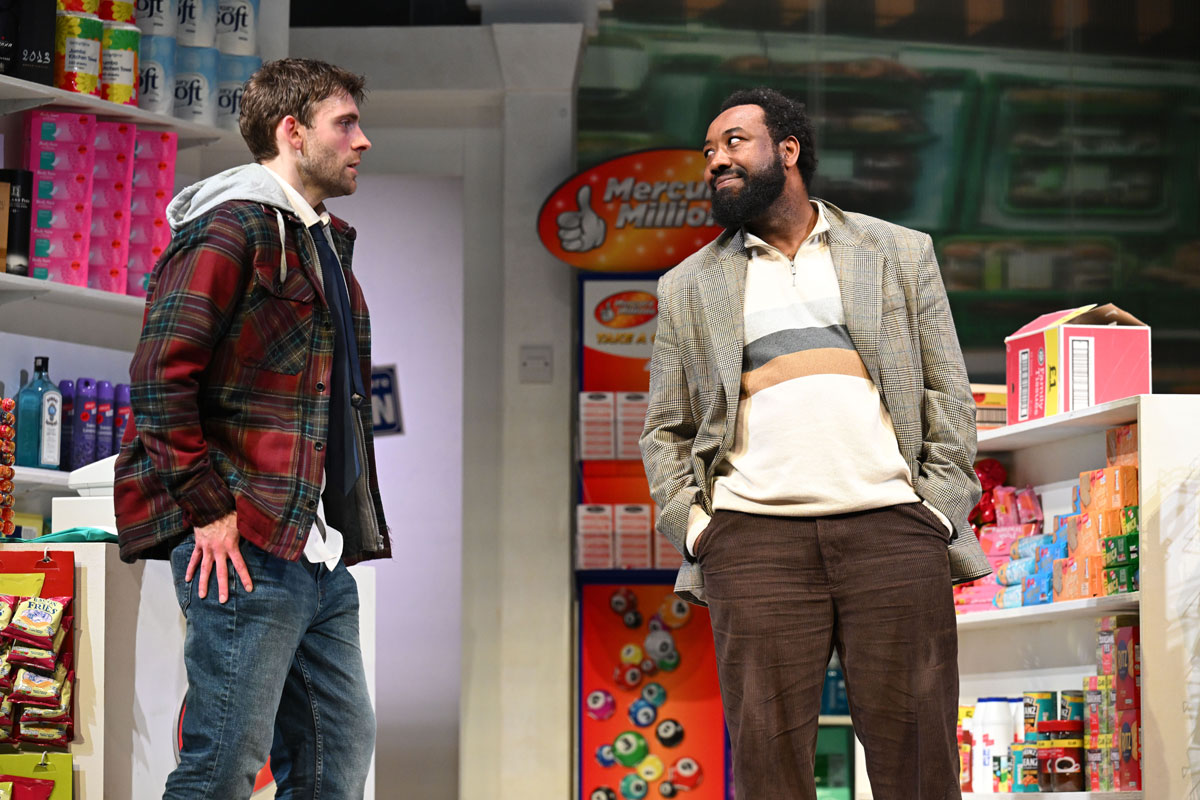 The sets and costumes were designed by Bretta Gerecke who is the resident designer at the Catalyst Theatre in Canada. There is a clever juxtaposition of the sets in the show. The first act features the mundane, drab setting of a small supermarket which is run on a shoestring, where we get to know the characters, their problems, and family circumstances. The second set features the post-win, lavish, rented home of Stuart, where Amy reigns. Additional areas of the supermarket and other locations appear as if by magic at the side of the stage, being lit up when needed. On two occasions these are a hospital, allowing us to see the contrasting big life events which are happening to the characters.