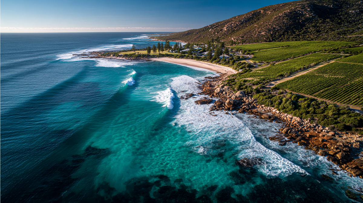 The coastline is surfing heaven, with fearsome waves pounding it westward from the Indian Ocean and northward from the Southern Ocean, with Cape Mentelle being where these waters meet. Unblemished white sand beaches punctuate rocky headlands while inland are green and lush eucalypt and karri forests that intersperse with farmsteads, orchards and vines.