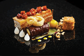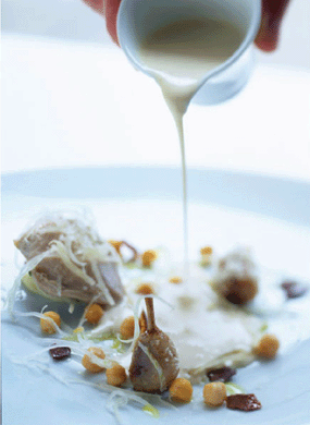 Our head chef Anthony Flinn did train with that master of culinary alchemy Ferran Adria (key phrase: ‘the ideal customer doesn’t come to my restaurant to eat but to have an experience‘). He is regularly mentioned in the same breath as Heston Blumenthal (key phrase: ‘anyone for bacon and egg ice cream?’). But, apart from a few foams, a couple of intense purees, a strange brown thing that looks like a peanut after nuclear war but tastes like heaven in microcosm, most of the things set in front of us look mouth-wateringly like food-as-you-know-it. And although your taste buds are teased and tested and tantalised they are never bullied or threatened.