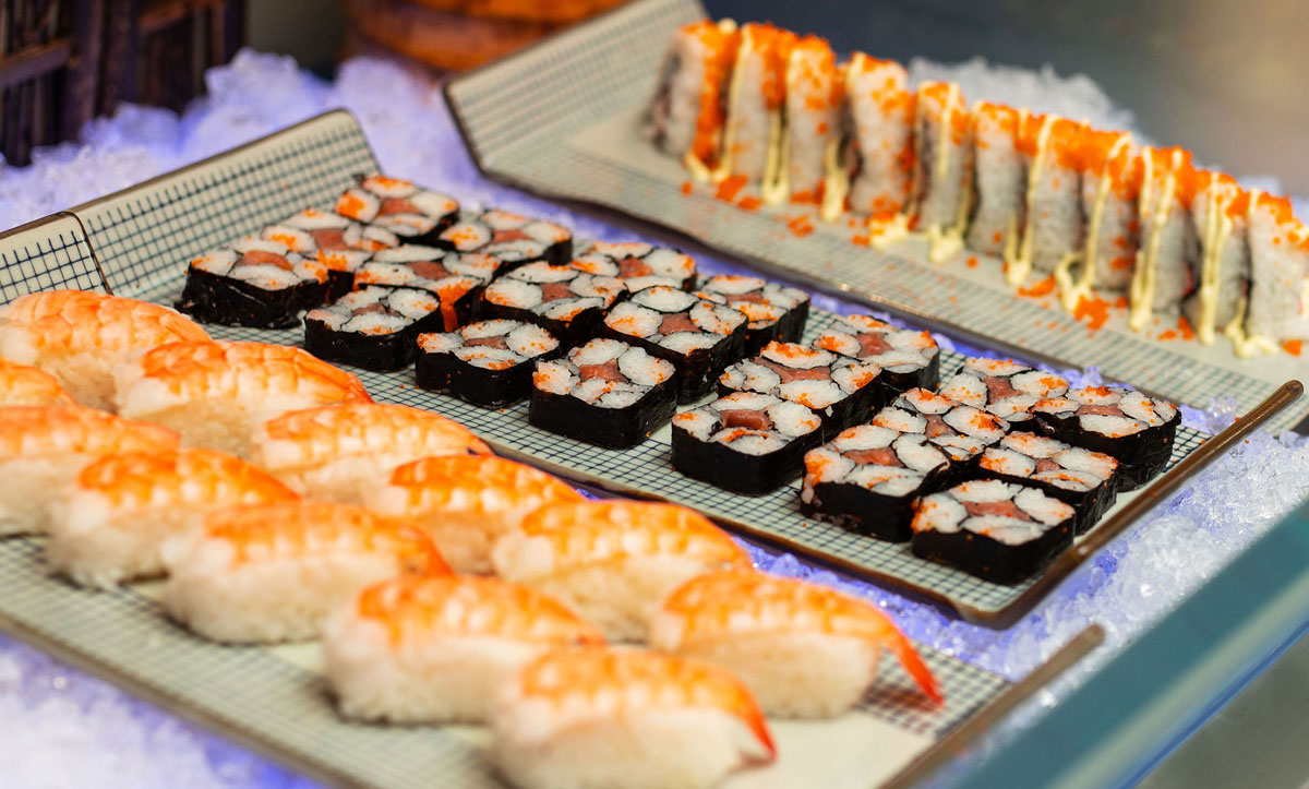 My plate soon featured spicy chicken uramaki, a salmon roll, tuna mayo sushi, crab stick caviar, and a beautiful sesame vegetable uramaki. The California roll, though not strictly authentic, was delicious — rice on the outside, filled with creamy avocado, crisp cucumber, and kanikama (imitation crab), garnished with toasted sesame seeds.