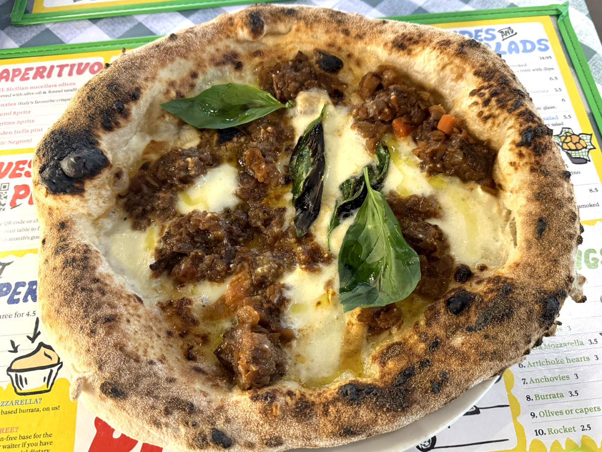 The 6-hour Genovese beef sauce, Provola mozzarella, Pecorino Romano DOP, basil, olive oil (£15.95) comes with a hint of celery and a dash of onion. Again, I’ve never come across this in Italy, but then again, they do things differently at Pizza Pilgrims. The huge pizza is ideal for sharing.