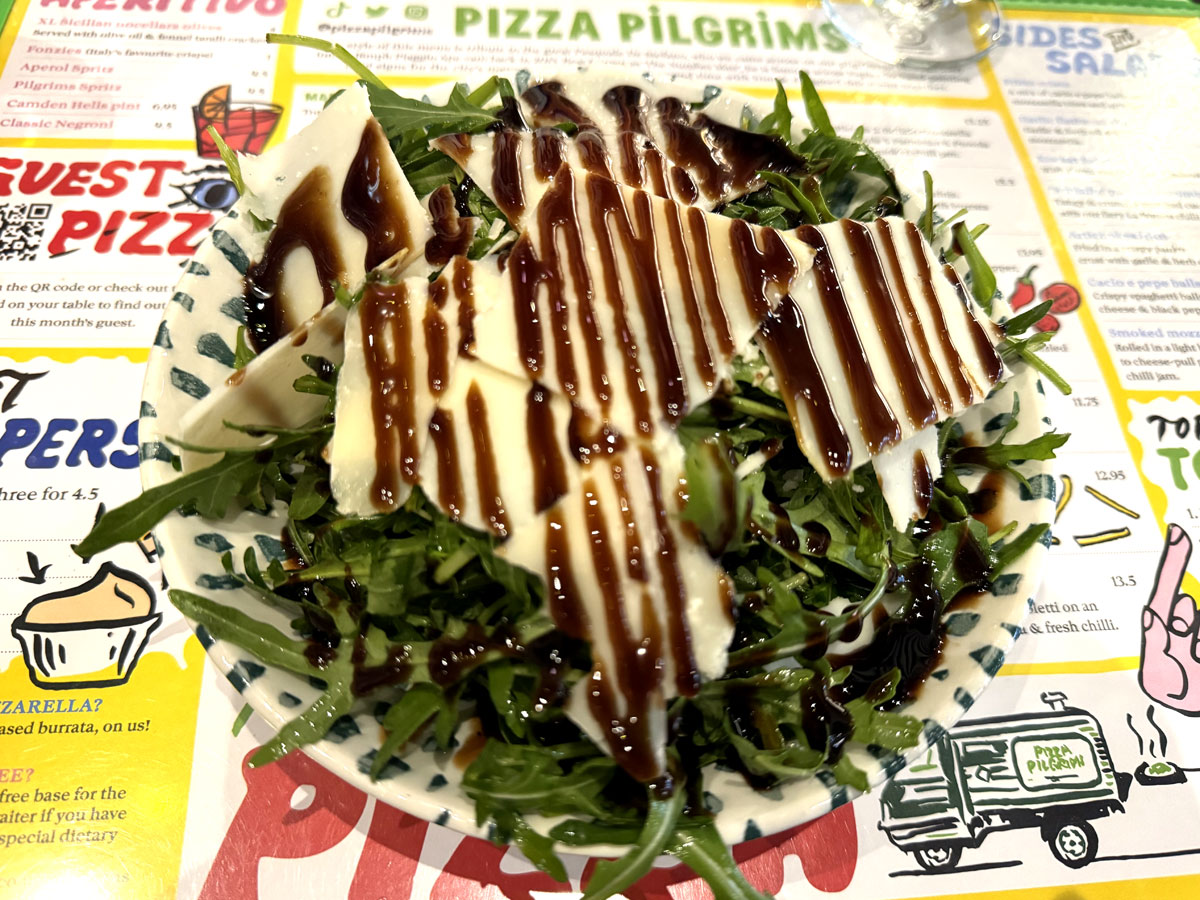 The Cacio e Pepe Balls (£8.50) were a good starter: crispy balls filled with spaghetti made with Pecorino cheese and black pepper. Although I’ve never seen them on a menu in an Italian pizzeria, this was a good introduction. My dining partner chose the Rocket Salad with Parmesan cheese and black pepper, with a balsamic glaze (£8.50), though the salad seemed to be drowned in balsamic rather than sprinkled.