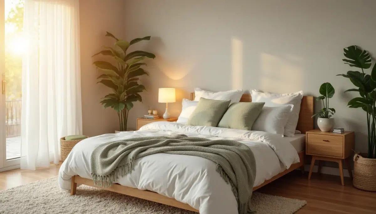 Pictured: Calming bedroom design using green and natural textures, indoor plants and a natural wooden bed frame.