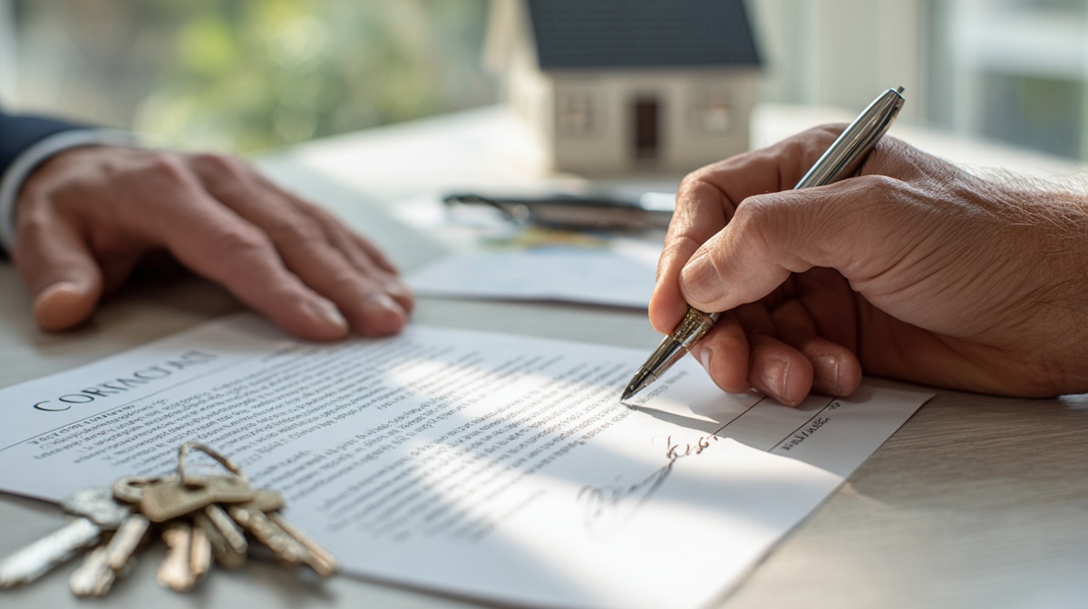 A close-up of hands signing a property contract with a solicitor, documents and house keys on the table, natural light, realistic editorial style, –ar 16:9 –v 7 Job ID: 4e8a4ca3-495a-4c9f-a669-bca92260c777