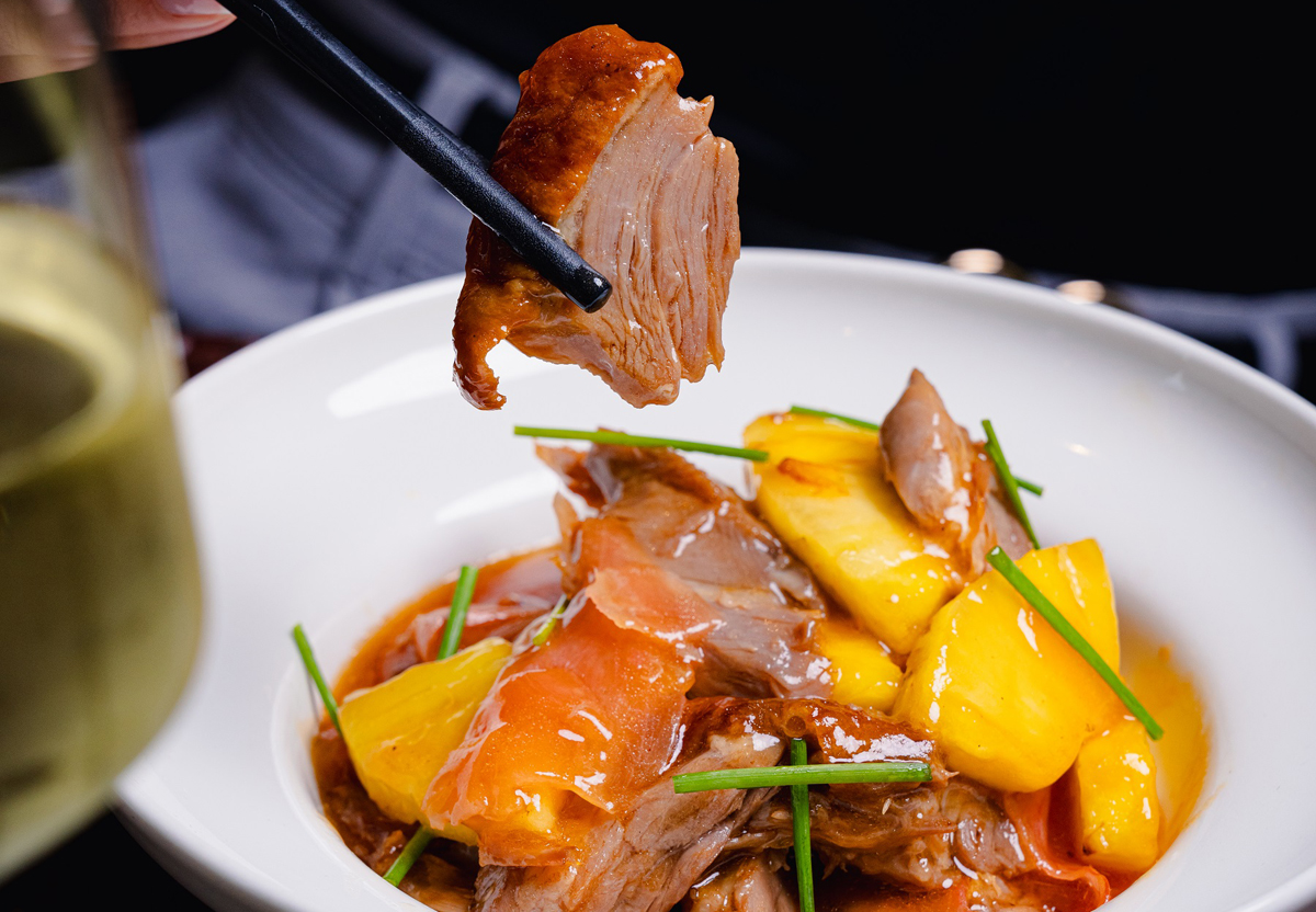 With my tastebuds tingling, and unable to make a decision, I choose a combination of steamed scallop, monkfish and prawn dumplings that are served alongside a delicate broth, followed by Tom’s recommendation – the crispy chicken – all washed down with a very delectable, citrusy Pinot noir. Being a big fan of seafood and dim sum, I am in my element as the dumplings arrive, stunningly presented. A hue of shocking pink and piping hot, they are certainly a step up from the usual fare you might encounter at a Chinese restaurant, and when they finally make it to my mouth, they simply melt on the tongue. Succulent and delicious, I manage to eat them all.