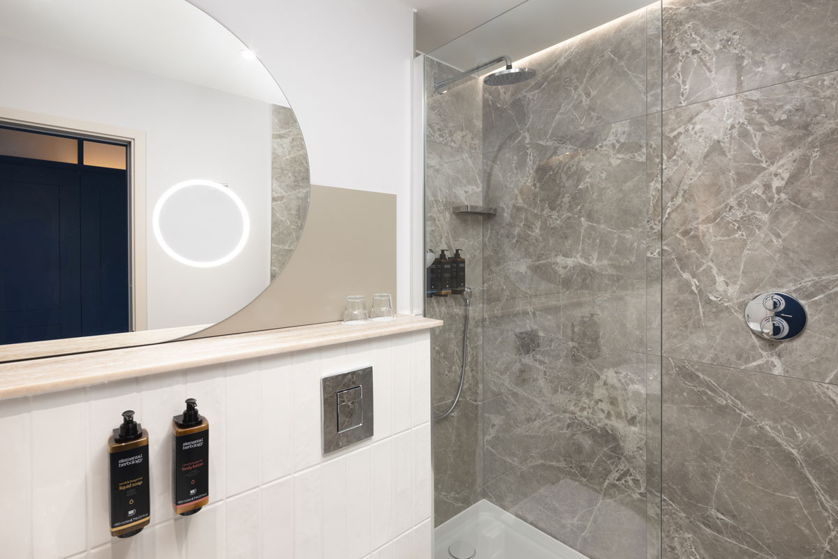 That being said, there’s everything you could possibly need – a large bed and dressing table area with plenty of hanging space in the wardrobe. The bathroom, with marble accents, has a walk-in shower, toiletries, a large mirror and a handy shelf. Fully kitted out with all the amenities, there’s tea and coffee making facilities available, including a sleek Nespresso machine, and a mini fridge stocked with soft drinks, canned water, and premium beers and wine.