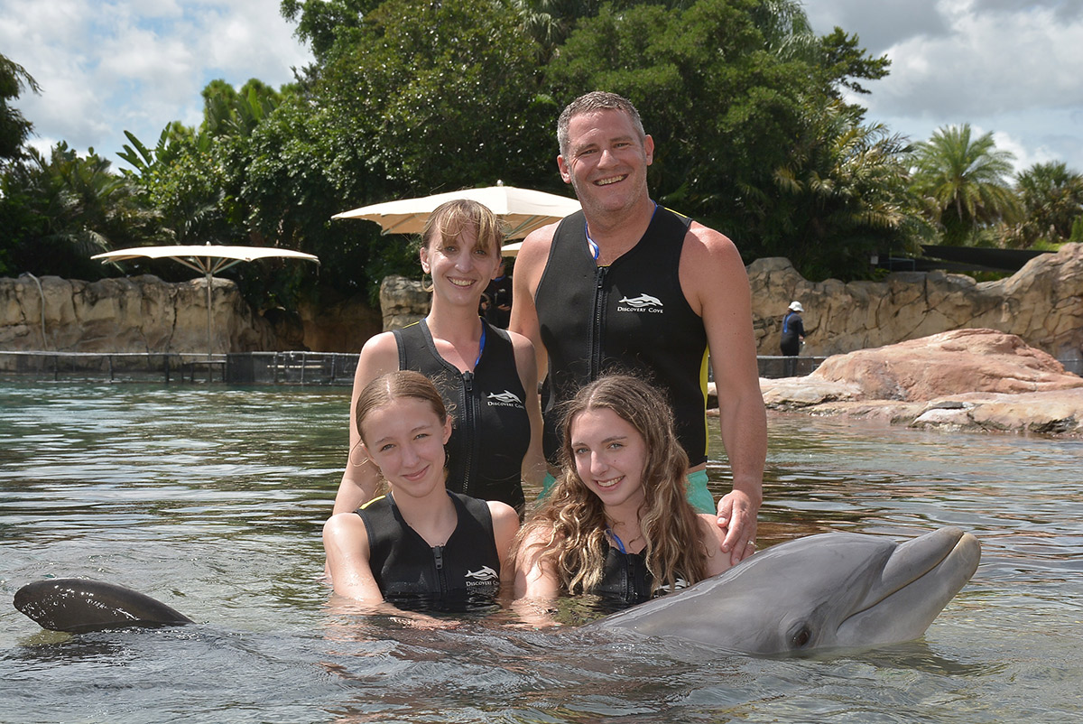 On our first morning, we strolled one mile down the road to one of our favourite places on Earth –Discovery Cove. During our day at this relaxed all-inclusive haven, we swam with Katerina and Calypso in the Dolphin Lagoon, took a walk on a recreated ocean floor alongside rays and sharks in SeaVenture, spent hours snorkelling with rays and tropical fish in the Grand Reef, and took a wander through the Flamingo Mingle are and the Explorer’s Aviary.