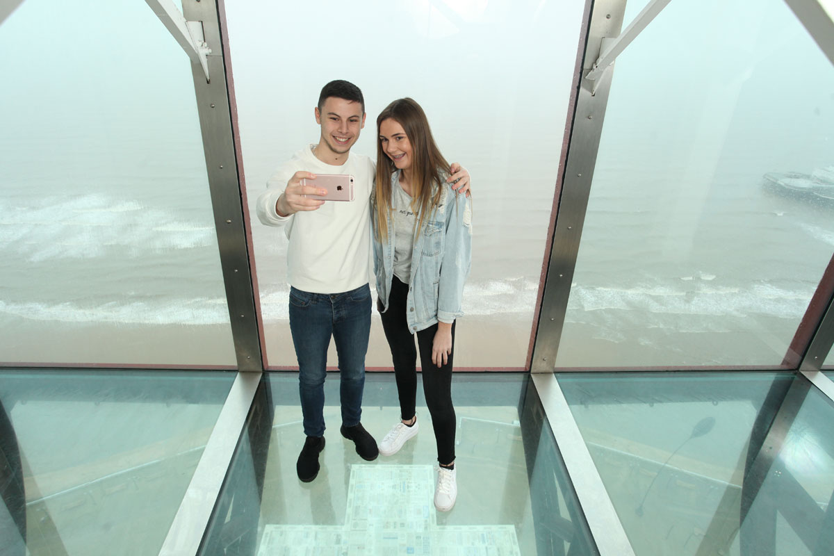 Anyway, after 15 minutes, we continued upwards. One more lift, then it was spiral stairs only to the very top. With my dodgy knee well and truly worked out, the views from the summit of Blackpool Tower on a blue sky day were as fabulous as you might expect – I was even brave enough to stand on the glass walkway.