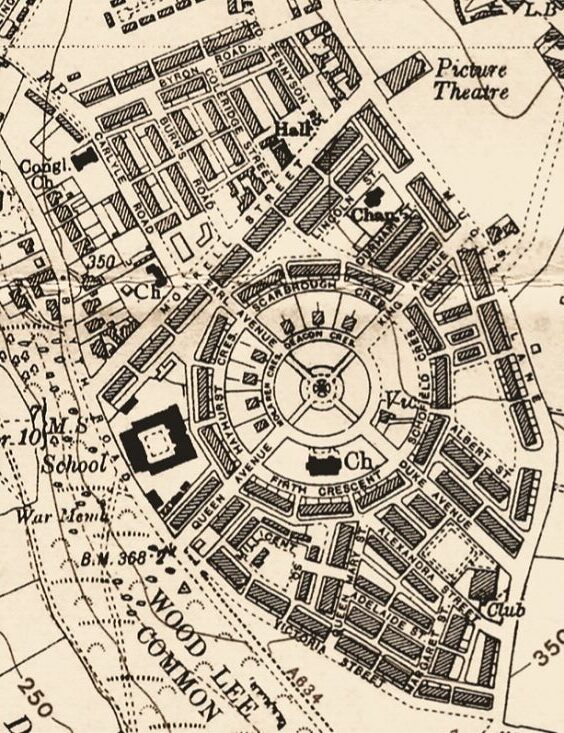The first street in the outer circle was called Scarbrough Crescent in honour of the owner of the land, the Earl of Scarbrough. The model village was then extended outwards to fill a roughly triangular area bounded by Morrell Road in the west, Muglet Lane in the east and Victoria Road in the south.