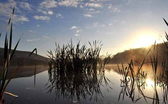 4. Double back down to the right and turn left at the junction, back onto the perimeter path with the light blue waymark. At the next red and blue post you can visit the lakeshore and the main route passes a second lake. Bear left on the red route uphill and keep straight on following the little valley on your left past an information panel. Keep right on the red and blue route and turn right at the junction to return to the car park and toilets.